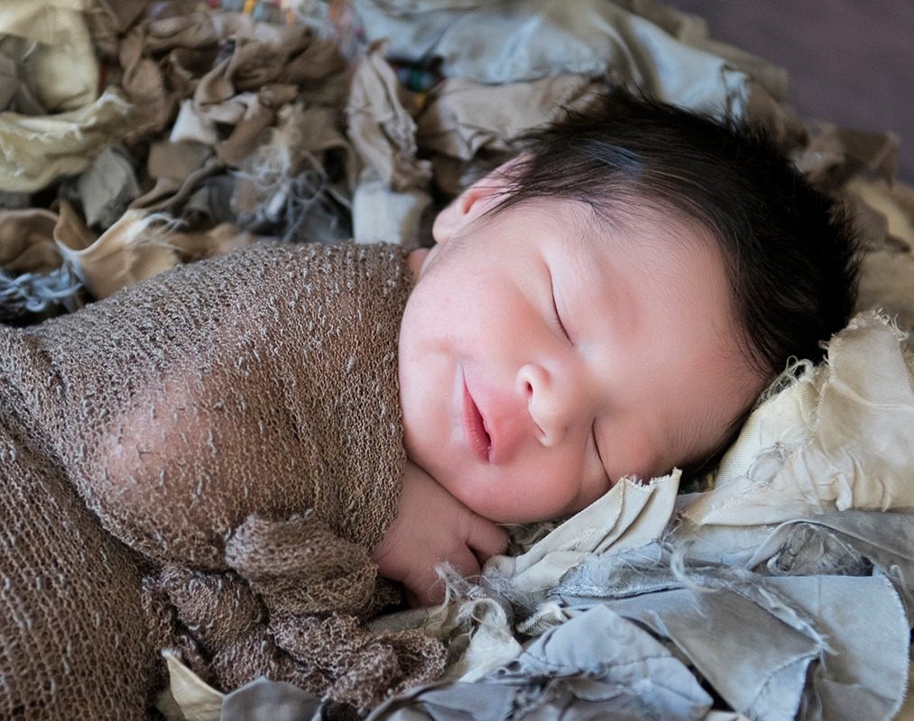 This newborn was less than 7 days old when I photographed him – and look at that hair! I used a neutral newborn wrap with a little rustic chic feel and this great torn fabric rug I bought at Anthropologie. He slept, and smiled, and yawned, and generally was perfect.