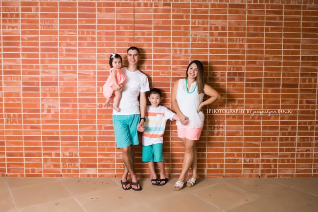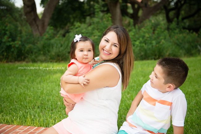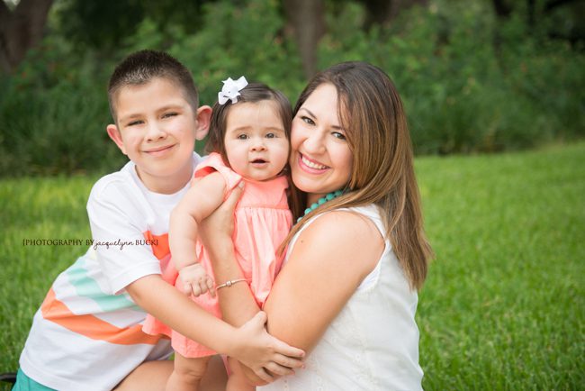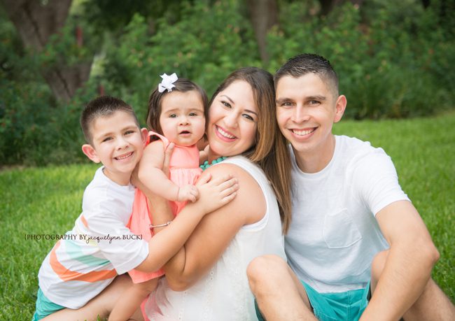 I was honored that the T Family drove 3 hours from Houston to San Antonio for a family session while I was visiting there, especially since it meant I had the chance to meet – and photograph – their sweet little girl for the first time! Though it did have all the makings of a terrible fail (poopy diaper and missing diaper bag, hot hot hot and humid, mosquitoes, threat of rain, grumpy kiddos and sun playing hide and seek behind the clouds), in the end, the session was a success! And I loved the color combo Lisa chose!